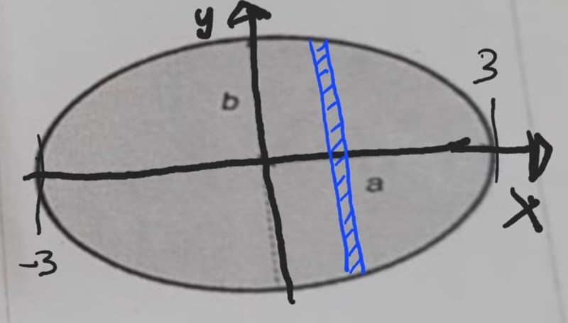Ja jag valde att ellipsen skulle rotera kring x axeln. Skulle inte radien av slipsen då hamna mellan y=0 och y=3 för b är ju 3
