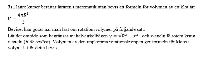 Hej! Jag har följande uppgift som jag ska lösa i Matematik 4 (rotationsvolymer):
