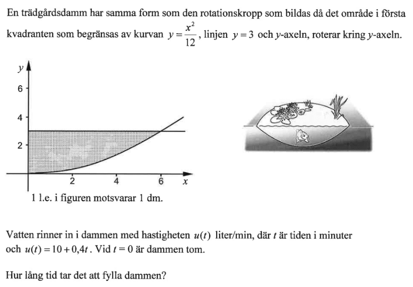 Du har räknat ut Cylinder minus Damm = 108pi – 54pi = 54pi dvs volymen av betongen under vattenkroppen. Med ditt sätt ska du först räkna ut cylindern (108pi) och sedan ta integralen 0 till 3 av pi 62 – pi (roten ur 12y)2. Den integralen blir snällt 54pi.