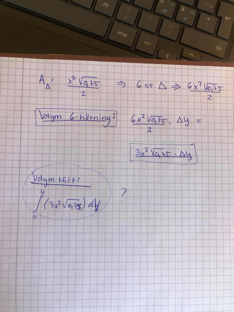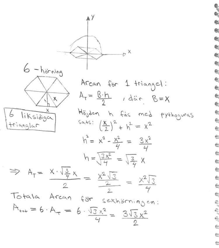 Jag har också kommit till att använda cirkelnsekvation som en formel för att beräkna x2. Vad händer sedan? Jag har också beräknat arean för den basytan som är en sexhörning. Ska man derivera då x2-y2och sedan beräkna integralen ? Hur ska man beräkna den då?