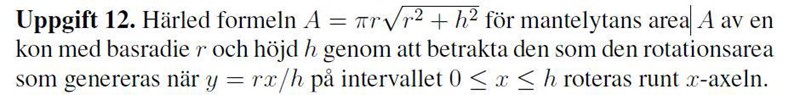 Man kan lätt räkna ut rotationsvolymen när y roterar kring x-axeln på intervallet. Den blir (med formeln ) . Men vad har det med rotationsarean att göra? Jag är osäker på sambandet.
