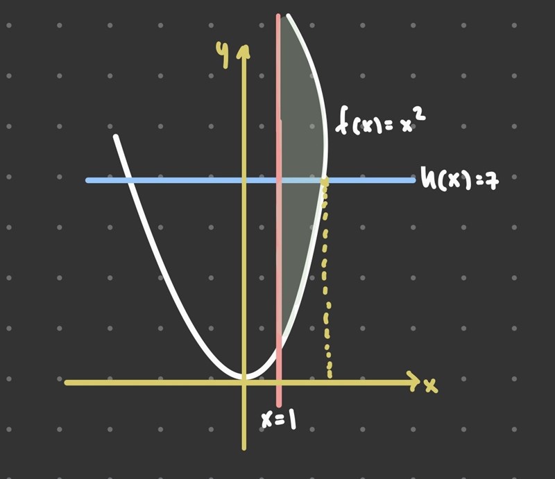 Nu så förstår jag ungefär att jag på något sätt behöver förskjuta funktionen så att rotationen sker kring x-axeln. Men jag är inte säker på hur det ska gå till. För jag tror att volymen ovanför som jag beräknade är begränsas av y=7 och y=x2 och roterar kring x-axeln. Hur ska jag tänka/gå till väga?