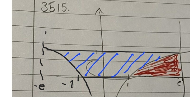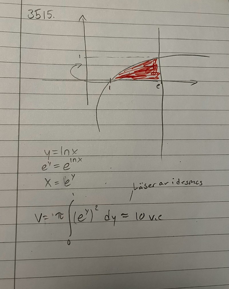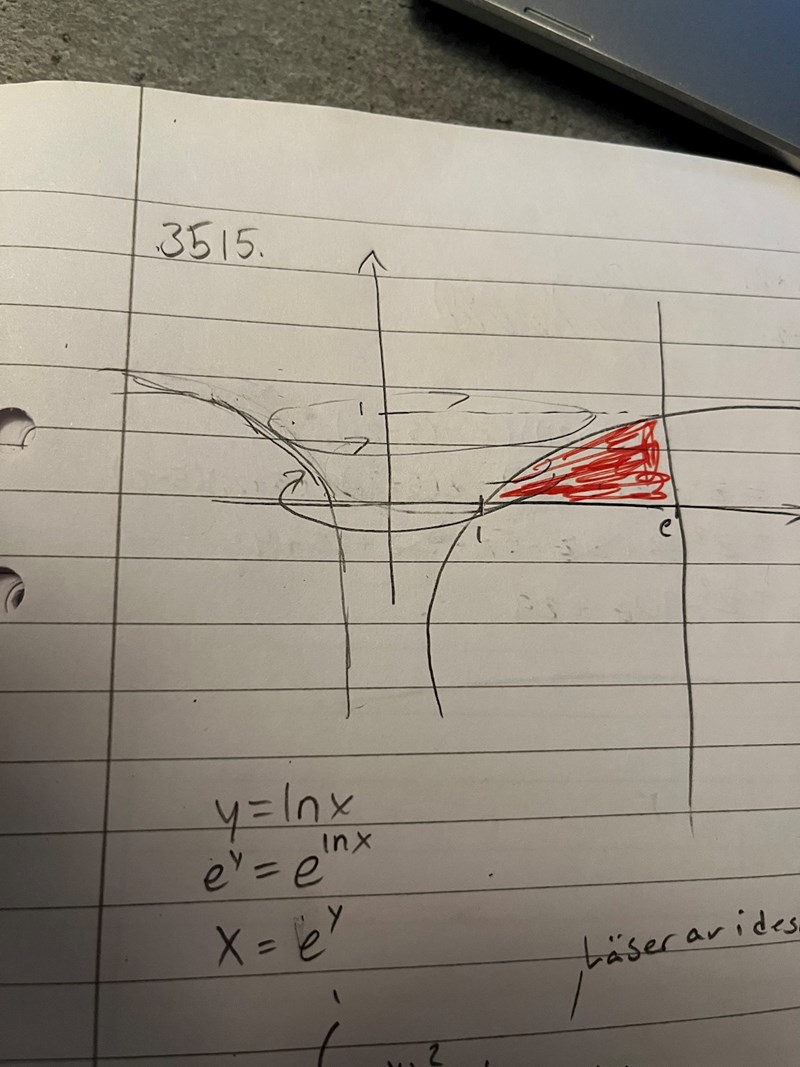 Hej! Jag försöker lösa den här fråga: "Låt det område som begränsas av kurvan y=ln x , linjen x=e samt x-axeln rotera kring y-axeln. Bestäm volymen av den uppkomna rotationskroppen.".