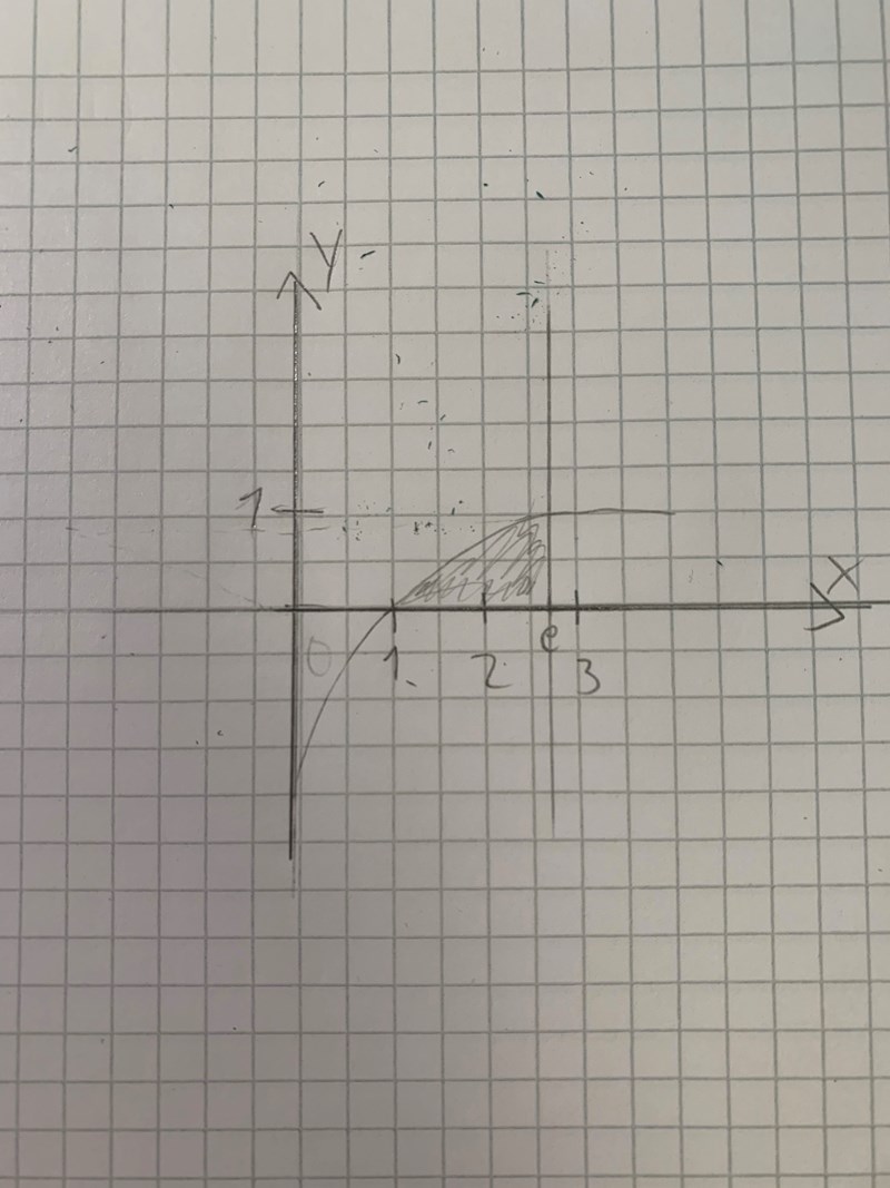 Låt det område som begränsas av kurvan y = lnx, linjen x = e samt x axeln rotera kring y axeln. Bestäm volymen av den uppkomna rotationskroppen.
