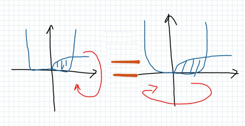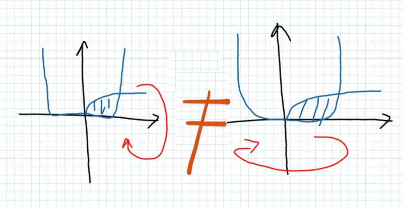Haha. Typ så här: Vid rotation medurs uppkommer en positiv rotationsvolym, men vid rotation moturs blir rotationsvolymen negativ 😁