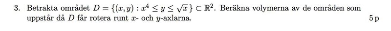 Om du roterar kring x-axeln så kommer ytterdiametern att vara och diametern på hålet (innerdiametern) att vara $$x^4. Integrera m a p x från 0 till 1.