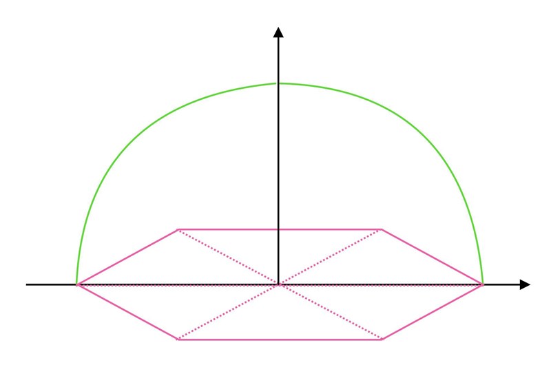 "Dela tältet i ett antal skivor som får en regelbunden sexhörning som basyta. Bestäm sedan volymen genom integration. Vilka mått får tältet för olika volymer mellan 1,5 m3 och 2,0 m3." Den gröna bågen är en halvcirkel.