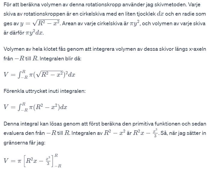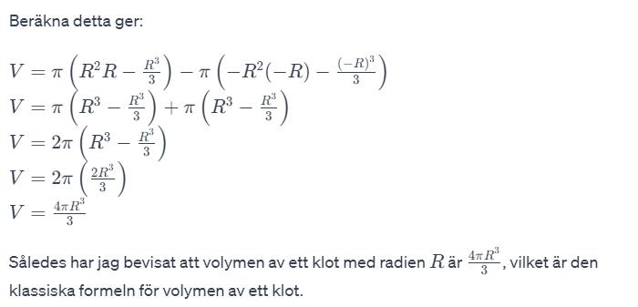 Beviset kan göras när man läst om rotationsvolymer på följande sätt: Låt det område som begränsas av halvcirkelbågen y = √R^2 - x^2 och x-axeln få rotera kring x-axeln (R är radien). Volymen av den uppkomna rotationskroppen ger formeln för klotets