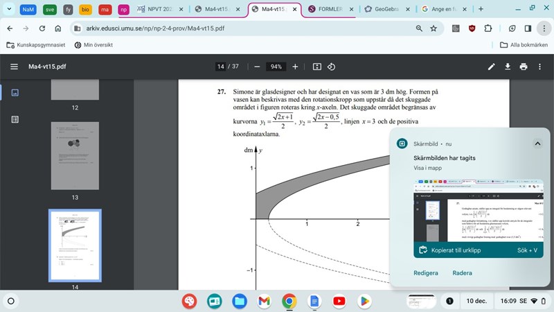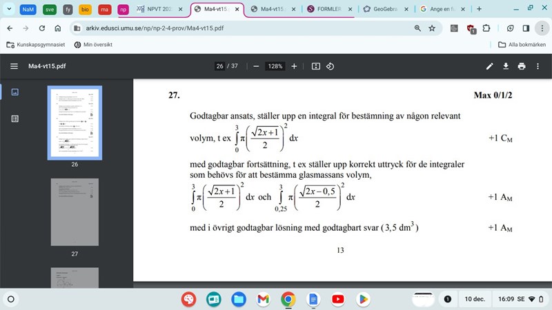 Eller får rätt svar nu men då ska jag isåfall ta ena rotationsvolymens svar minus den andra, inte plus? Stämmer detta