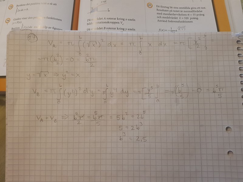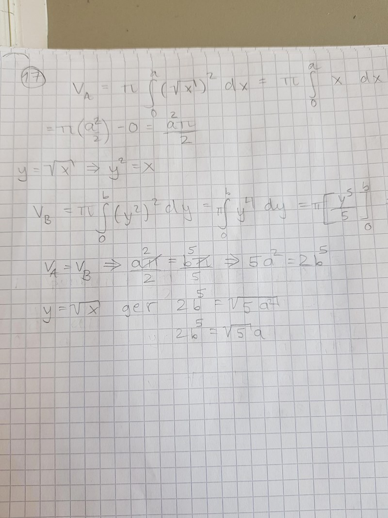 Du vet att Va=πa22V_a=\pi\frac{a^2}{2} och att VB=πb55V_B=\pi\frac{b^5}{5} samt att b=ab=\sqrt{a} och att Va=VBV_a=V_B.