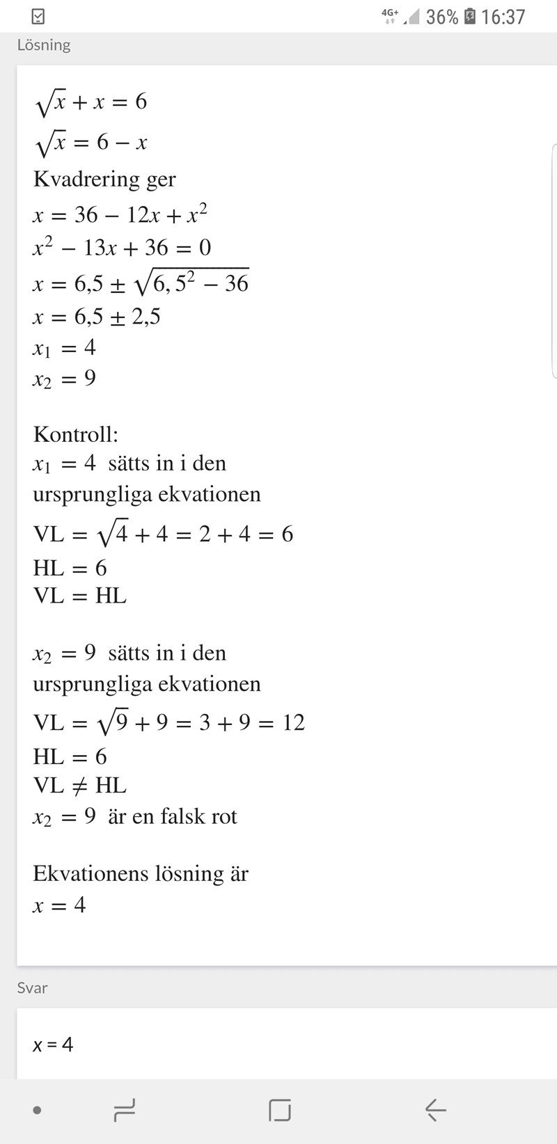 När jag räknar ut detta får jag svaret x1= 9 och x2= 4