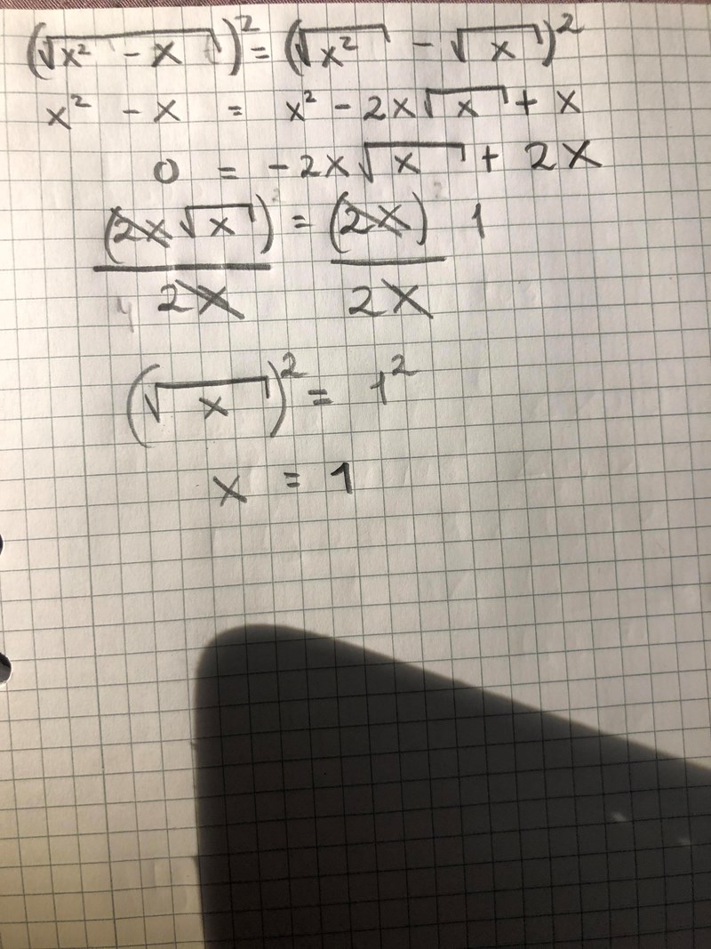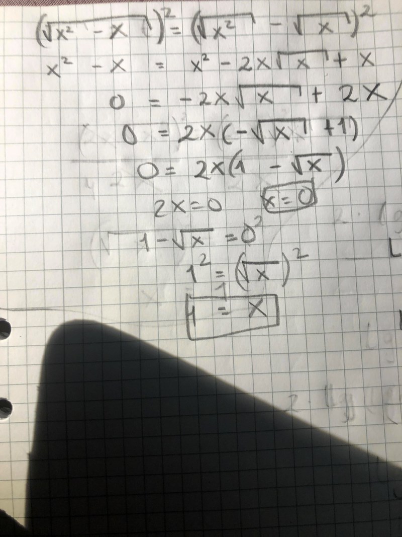 x2-x=x2-xlös ekvationen. Min uträkning : x2-x2=x2-x2x2-x=x2-2×x×x+x2x2-x=x2-2xx+(x)2x2-x=x2-2xx+xkvar blir 2xx=0som kan skrivas som 2x×x12=0x(2-x0,5)=0x(2-x)=0x1=0x2=4jag vet att x2 är fel. Hur ska man tänka?