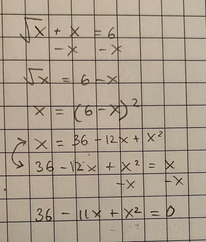 Ordna, om det går, så att det du kvadrerar bara är ett rotuttryck. Här kan du skriva om ekvationen till x=6-x\sqrt{x} = 6-x först.