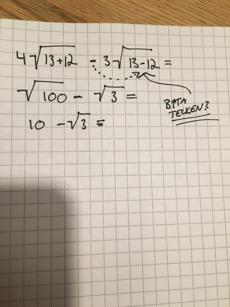Man måste ta det försiktigt med rötter, man kan inte behandla dem hur som helst. Du kan inte multiplicera ett tal som är en rot med ett tal som inte är en rot så som du gjort ovan. Det enklaste i denna uppgiften är att först beräkna rötterna eftersom dessa rötterna är "snälla" och enkla att ta reda.