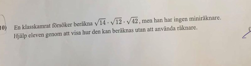 Jag tänker att man måste sätta alla tal i kvadrat och sedan hitta gemensamma faktorer för alla tal. 7*2, 3*2*2, 7*3*2. Vet inte hur jag ska göra sedan.