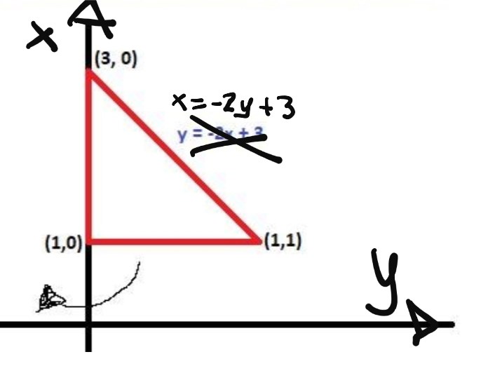 Såg inte att din bild var helt felritad - trianglens hörn har koordinaterna (0,1), (1,1) och (0,3) i stället fö rde som är angivna i uppgiften.