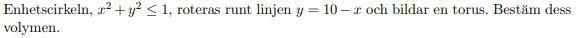 Rotera enhetscirkeln kring y = 10-x och bestämma volymen på den torus som genereras.