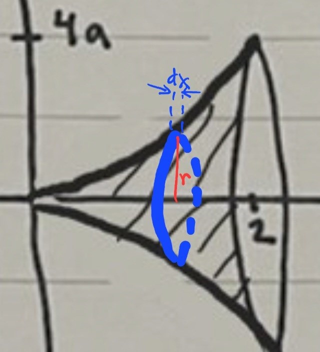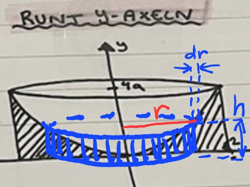 Så integralen blir V= Area* tjocklek = 2pirh dx från 0 till 4? Och ska jag räkna ut den eller sätta den = x-axelns integral?