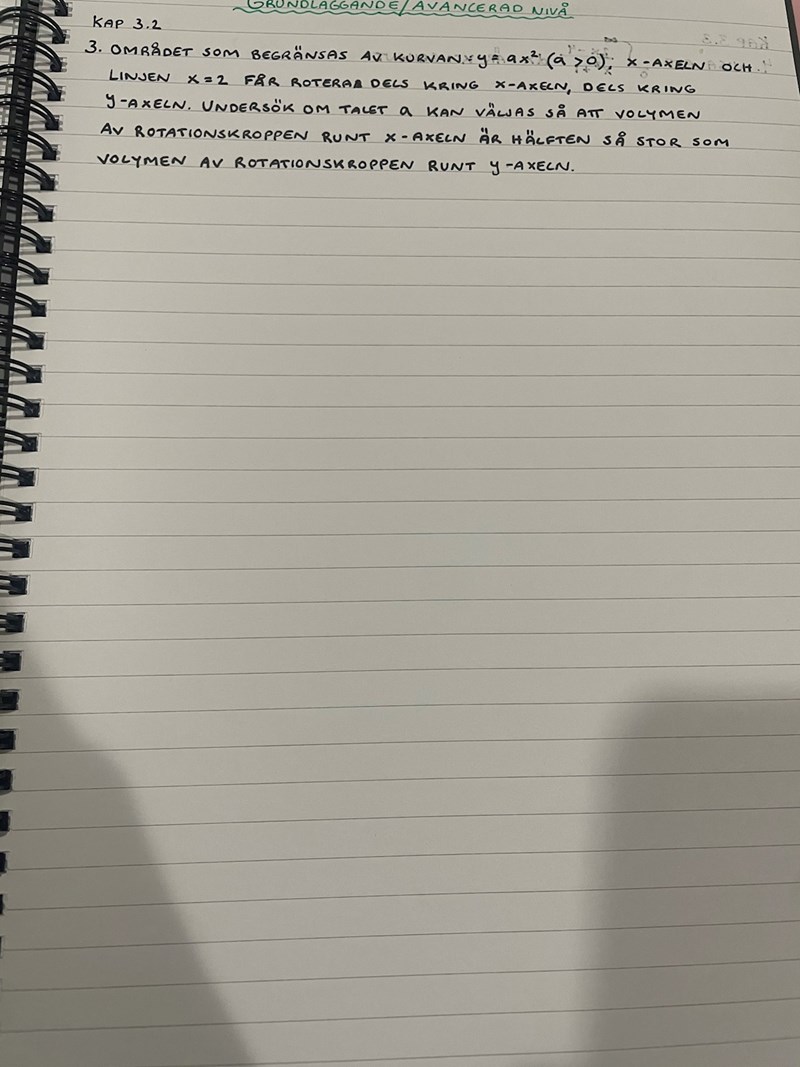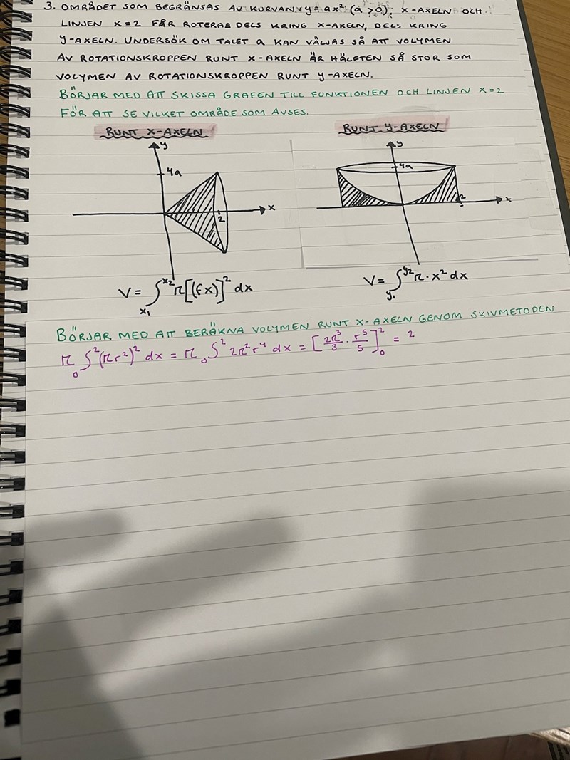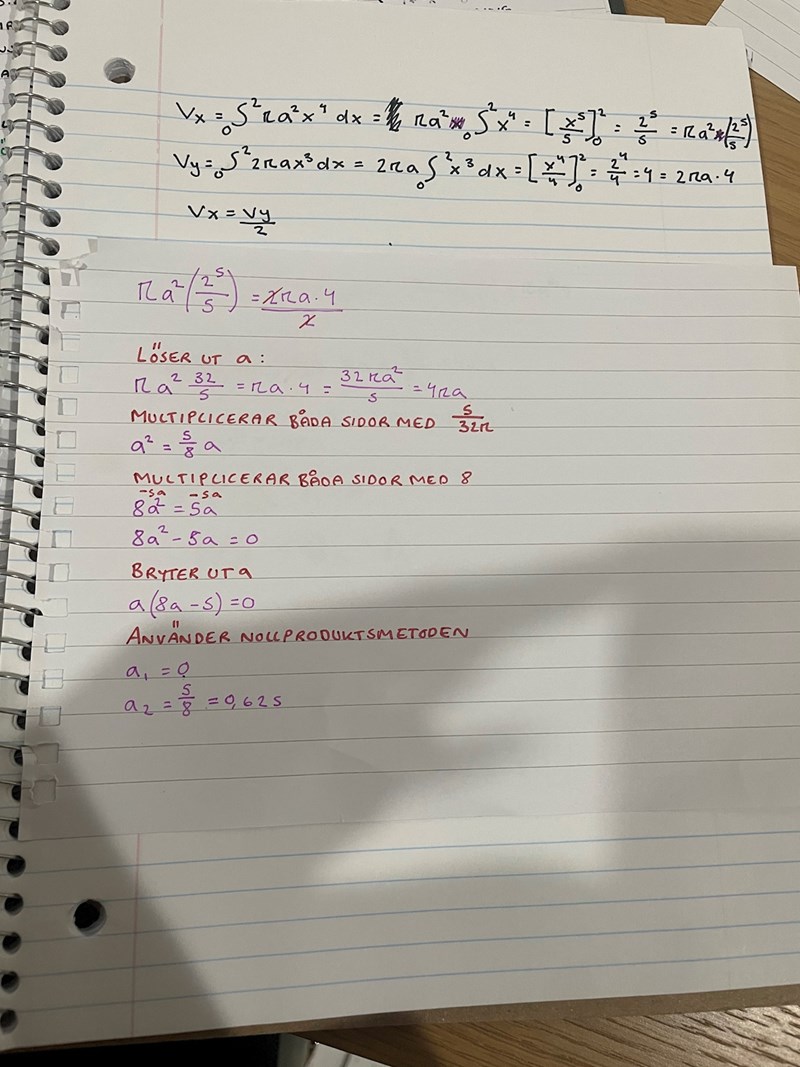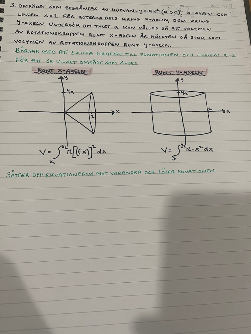 i frågan står det ” undersök om talet a kan väljas så att volymen av rotationskroppen runt x-axeln är hälften så stor som runt y- axeln”. Jag antar då att jag ska kunnna bevisa att a= 0,625 blir hälften så stor i funktionen för y- axeln? Men hur gör jag det?
