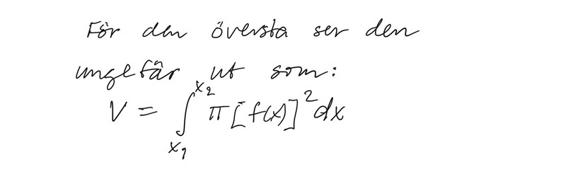 blir den andra då integralen av y2 y1 (vet ej hur man skriver ut tecknet här) (pi(f(x)^2 dx)/2och x då som en funktion av y?