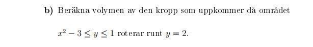 När du roterar en kurva (kurva, inte område som i uppgiften) kring x-axeln så summerar du ju över skivelement med volymuttryck πf(x)2dx \pi f(x)^2 dx där f(x) f(x) alltså representera avståndet mellan x-axeln och kurvan. Vad du helt enkellt behöver göra är att modifiera detta uttryck så att du istället för att ha avståndet mellan kurva och x-axeln så har du avståndet mellan kurva och y=2-linjen.