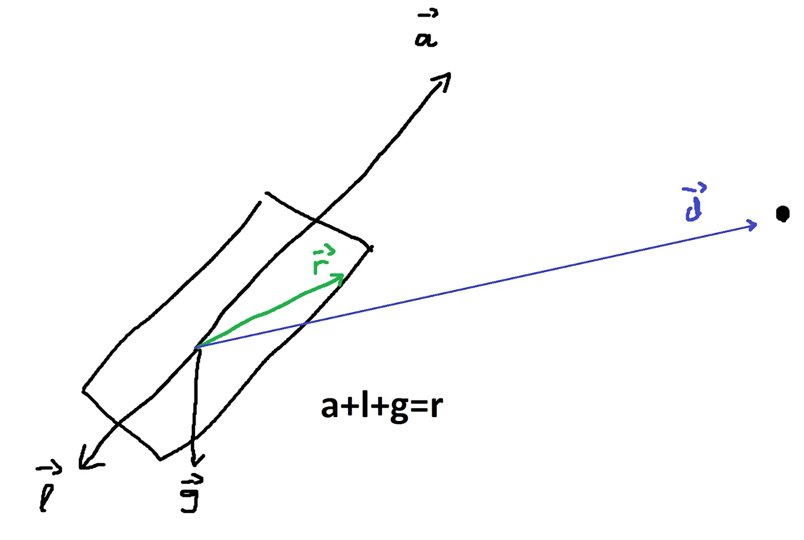 Kortfattat så ska vi vrida motorn med en viss vinkel (den jag söker) så att luftmotstånden + gravitationen + accelerationskraften resultar i att r-vektorn blir parallell med d-vektorn. Alltså att vi alltid ser till att den resulterande riktning rymdskeppet åker i är mot en viss punkt, vektorn d är vektorn mellan rymdskeppet och denna punkt.