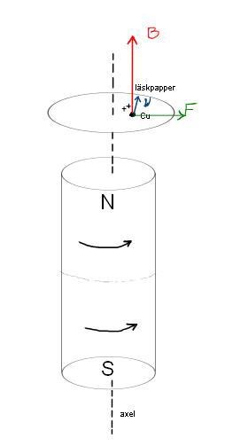 Marx skrev:JohanF skrev:Marx skrev:JohanF skrev:Jag tror du har ritat cu-jonernas hastighet åt fel håll. stavmagneten roterar åt det håll du ritat hastigheten, vilket får konsekvensen att Cu-jonerna roterar åt andra hållet, relativt stavmagneten.