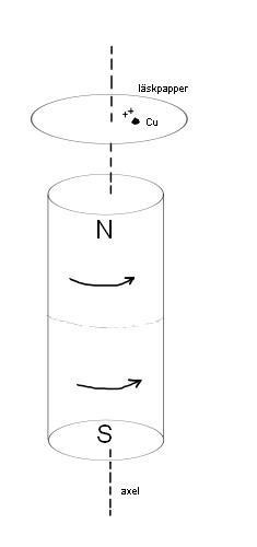 En cylinderformad stavmagnet roterar kring sin axel i pilarnas riktning som figuren visar. Ovanför magneten har placerats ett fuktat läskpapper. En droppe kopparsulfatlösning släpps ned på läskpapperet en bit från magnetens rotationsaxel.