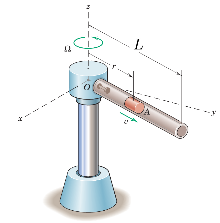 Det ihåliga röret med längden L roterar runt en vertikal axel genom O med en konstant vinkelhastiget θ˙=ω\dot{\theta}=\omega. En cylinder med massa mm glider friktionsfritt inuti röret. Cylindern börjar på ett avstånd r0r_0​​ och har då farten v_0​​ längs röret. Beräkna magnituden av den horisontella kraften PP som verkar på cylindern precis när den lämnar röret. Svara i termer av L,v0,m,ωL, v_0, m, \omega och r0r_0. [Notera att Ω\Omega i figuren är det som kallas $\omega$ i uppgiftstexten.