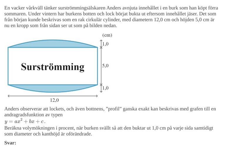Nej, det blir som en amerikansk fotboll. Detta eftersom grafen är parabelformad och högre på mitten än vid kanterna. Men oavsett det så ser den då uppkomna rotationskroppen inte alls ut som surströmmingsburken.