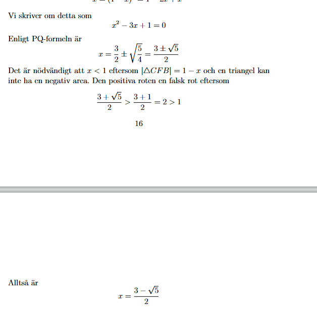 När man har problemlösningsuppgifter med andragradsekvationer får man oftast en rot som inte är aktuell eller rimlig i uppgiften. Hur kan man då på bästa sätt redovisa det? Jag har sätt att vissa bara skriver "orimlig" inom parentes bredvid den orimliga roten och att andra skriver att den inte är betydelsefull osv. Så vad är mest korrekt att göra? Och behöver man motivera varför den är orimlig eller räcker det bara med att man visar att man fleatår att den är orimlig i uppgiften?