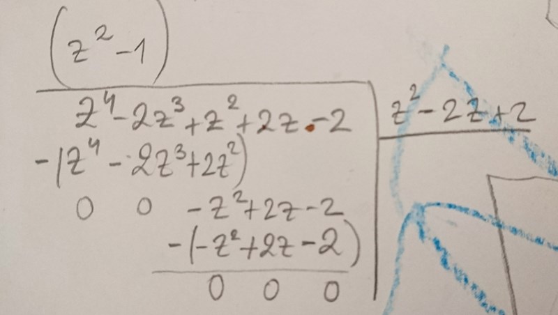 I ditt fall ska du dela med (z-1-i)(z-1+i) Det är fiffigt att multiplicera ihop detta innan du dividerar.