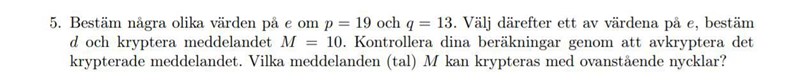 Jag valde att e = 5 eftersom sgd(5, 216) = 1. Sen för att bestämma d så har jag att ed1 mod (216). Jag räknar sedan vidare och får den diofantiska ekvationen 5d - 216k = 1. Jag får fram att d = 43 men om jag löser mitt svar i exempelvis mathematica får jag att d = 173. Förstår inte vad jag gör för fel när jag använder mig av Euklides algoritm för att bestämma d.