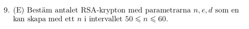 Enligt facit så ska svaret vara följande: 56, om vi tillåter ett av primtalen att vara 2; annars 44. (Detta räknar även e = 1 som inte skulle väljas i praktiken, men metoden fungerar även för detta e.)