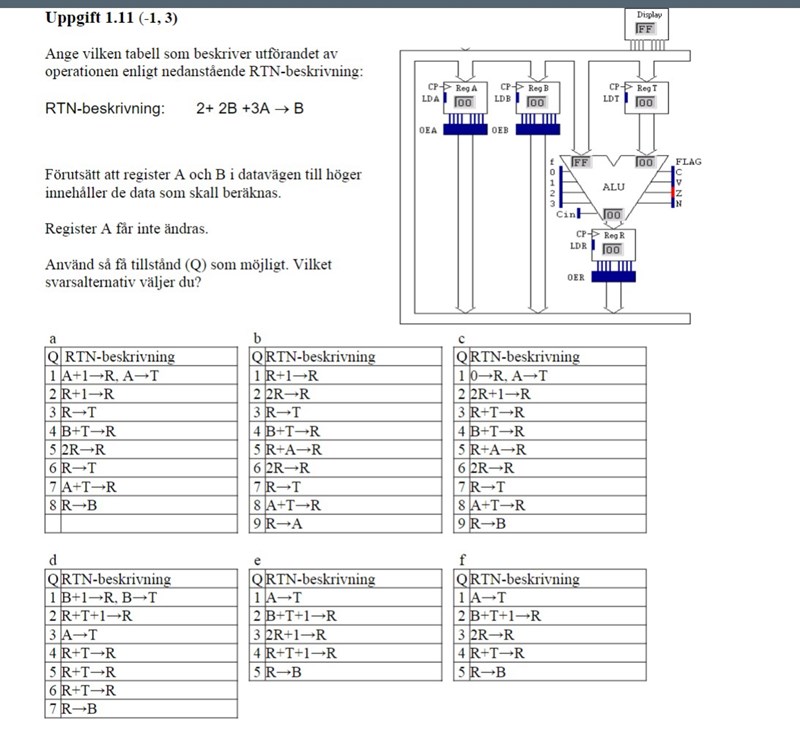 Här kunde jag nästan lösa den här frågan med uteslutningsmetoden. Med tanke på att vi måste börja med att ladda T registret som första steg blev e och f endast de aktuella kandidaterna för rätt svar. Jag vet dock inte varför f skulle vara rätt, skillnaden är att man adderar 1 två extra gånger i e. Vet inte varför man skall addera med 1 från början i Q2 som de gjort i båda stegen.