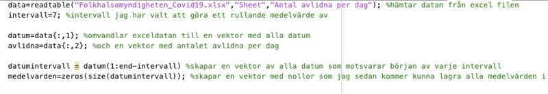 Jag ska skriva en kod som beräknar ett rullande medelvärde för 7 dagar av antalet avlidna pga corona och sedan plotta det. Jag vill alltså addera de första 7 dagarna (1-7) och beräkna medelvärdet av dem. Sedan vill jag gå fram ett steg i vektorn och beräkna medelvärdet av nästa 7 dagarna (2-8) sen dagarna (3-9) o.s.v. Någon som vet hur jag kan göra detta? jag är lite lost