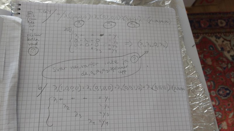 det är uppgiften. Och man ska då enligt vad jag förstått kolla om man kan uttrycka en annan vektor y, del av R^n men INTE någon av vektorerna i uppgiften, mha dessa.