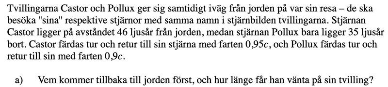 Eller kanske ännu tydligare: Låt dem åka med ljusets hastighet. Hur länge får Pollux vänta och hur spelar relativistiska effekter in på resultatet/beräkningarna?