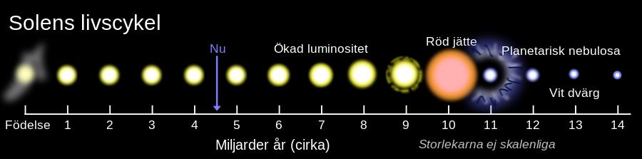 Solens beräknade livscykel illustrerad som en tidslinje med solens olika faser