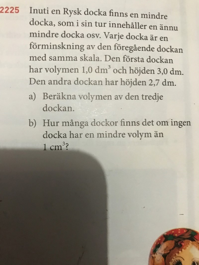jag vet att volymskalan är (2,7/3)^3 men hur hittar man tredje dockans volym och b ser omöjligt ut!