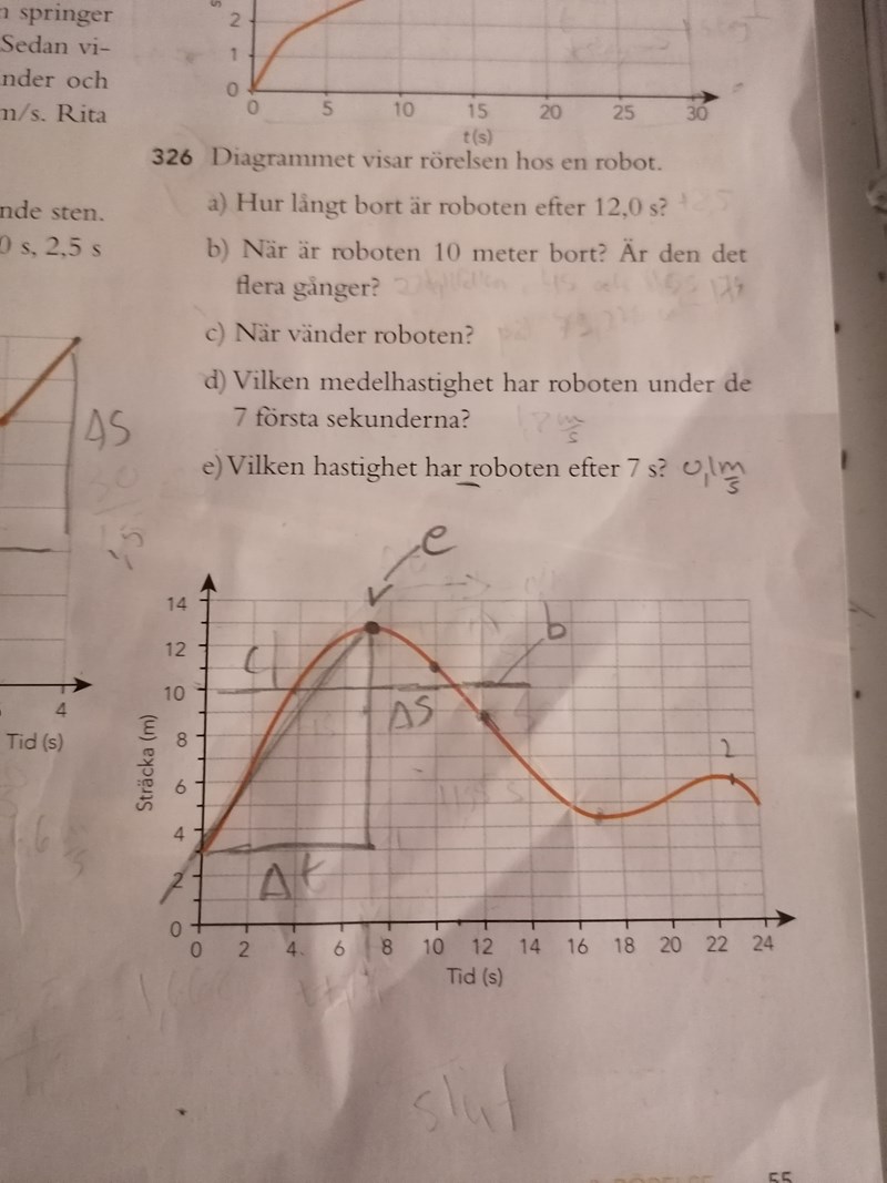 e-uppgiften är lite tvetydig (enligt mig). Vid tiden 7 sekunder kan man läsa av hastigheten direkt i diagrammet, men efter 7 sekunder varierar hastigheten ända fram till tiden 24 sekunder.