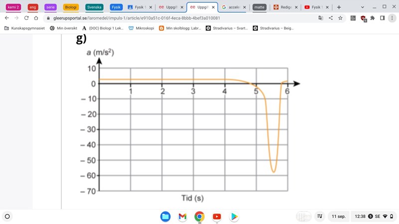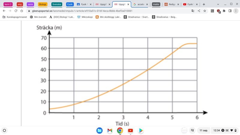 f) Man får ett s-t diagram genom att beräkna arean under grafen, jag förstår varför de har ritat så som de har gjort i bilden nedanför från 1-5 sekunder, men från 5-6 sekunder vet jag inte hur de har tänkt, för det finns ingen area att beräkna där för att få reda på sträckan.