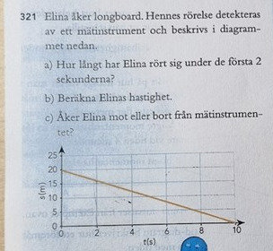 Titta på diagrammet! På x-axeln har du tiden, på y-axeln avståndet (till någon punkt). Hur långt bort är Elina vid t = 0? Hur långt bort är hon vid t = 2? Hur långt har hon rört sog under de två första sekunderna?