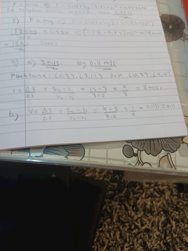 För att beräkna medelhastigheten ska du ta . Det har du gjort och du har valt att delta t är 9 (alltså att intervallet är 9 sekunder). Delta s blir då sträckan som bilen rört sig under dessa 9 sekunder.