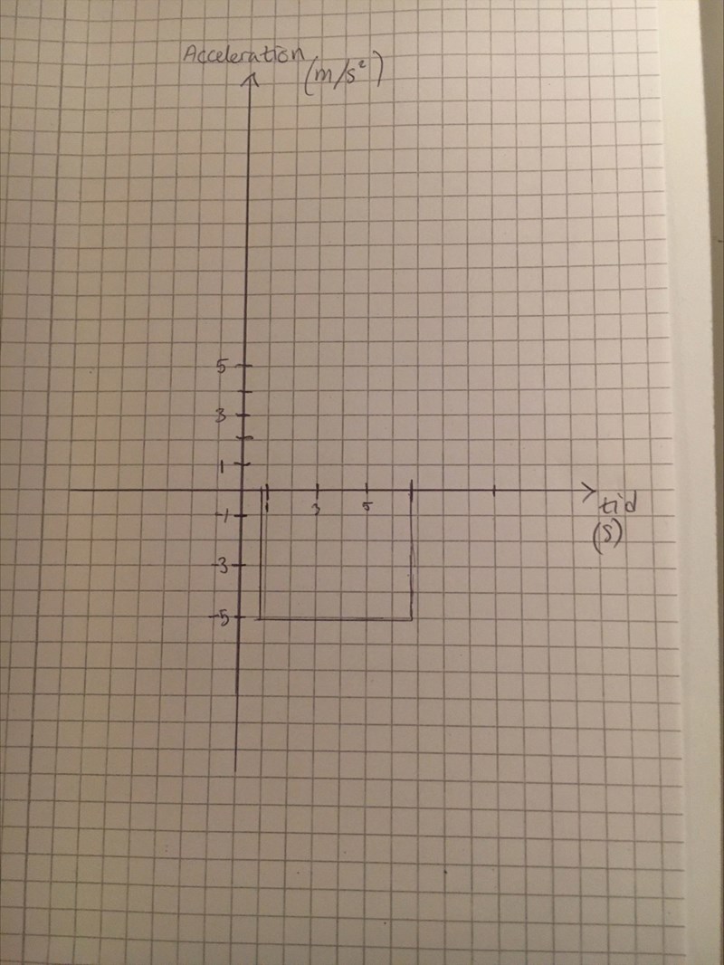 a-t: ingen acceleration under de första 0,84s, sedan -5,1m/s2 under inbromsningen