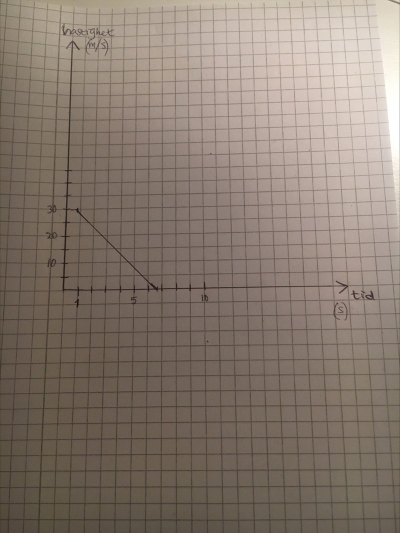 v-t: 30 m/s under de första 0,84s, sedan en rät linje med lutningen -5,1 m/s2