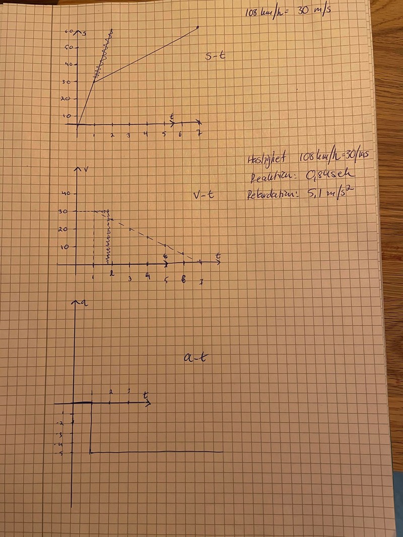 Hej! Tänker jag rätt här: Hastigheten är 108 km/h dvs 30 m/s. Reaktionsstiden 0.84 sek och acc belopp under inbromsning 5.1 m/s^2. Rita ut s-t, v-t samt a-t graf: