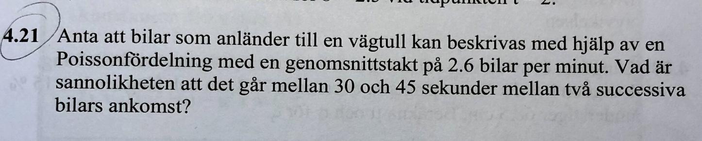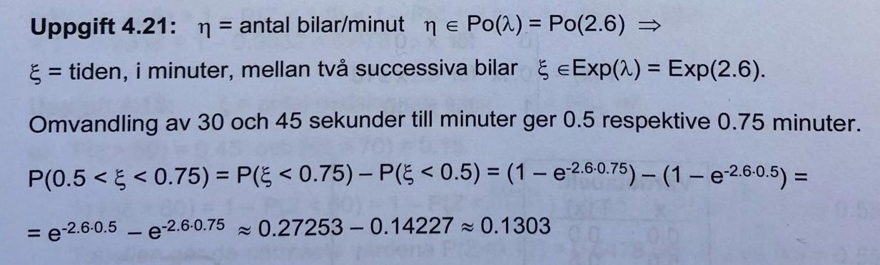 Tiden mellan två Poisson-händelser är Exponential-fördelad. Eftersom frågan handlade om tiden mellan två bilar används därför exponentialfördelningen, eftersom tiden mellan bilarna följer den fördelningen