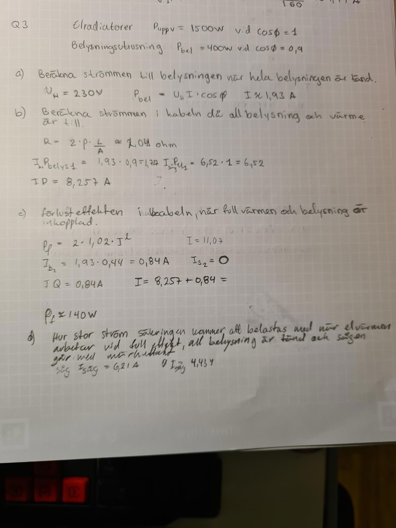 b) Beräkna strömmen i kabeln då all belysning och värme är till.