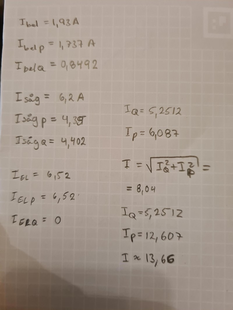 det underlättar en del och nu förstår jag om gällande b) frågan. Jag tror att jag får fel svar nu i d) att jag kanske räkna fel ström via sågen de vad jag misstänker misstänker. Jag delade effekten från sågen med effektfaktorn och spänning som är given från sågen som är 230V och får ut sågen strömmen. Efter det så försöker få ut som Iq och Ip. och summera med dem andra Iq och Ip genom kvadrera och sen rotenur och få ut strömmen. Men jag fick ändå fel svar. Har jag missat nåt?
